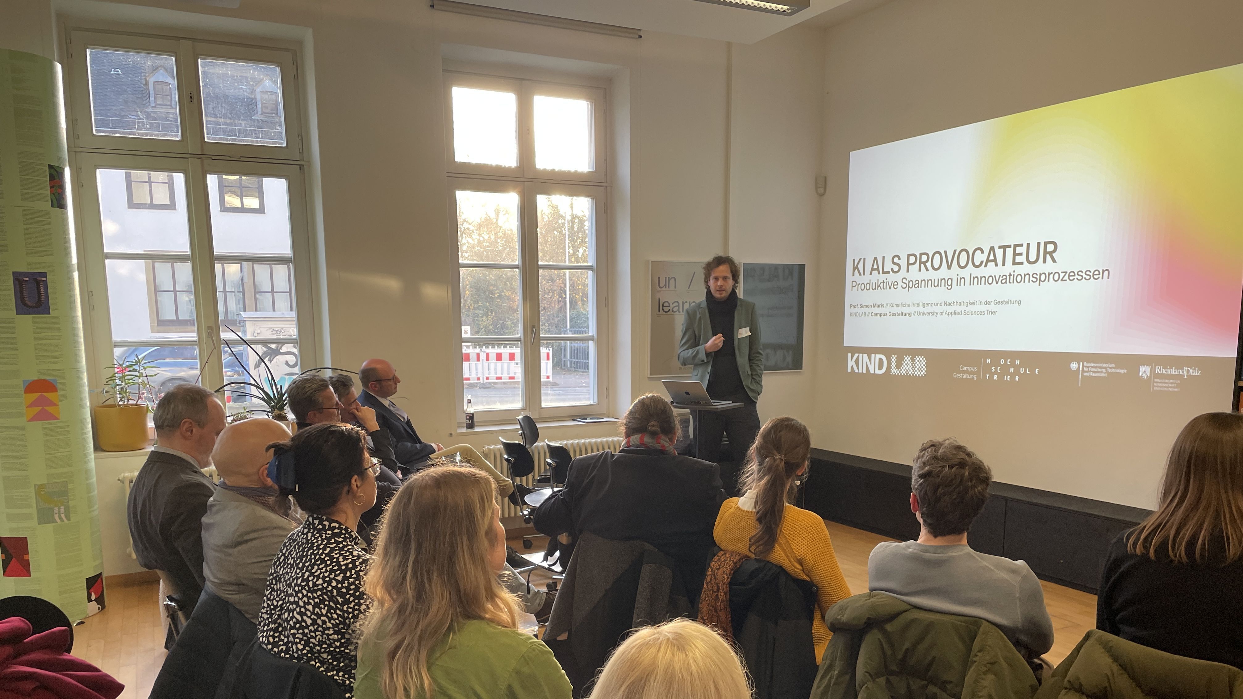 Auf das Schwerpunktthema der Veranstaltung blickten die folgenden Vorträge dann aus ganz unterschiedlichen Perspektiven: Professor Georg Rock von der Hochschule Trier ging in seinem Vortrag „Zwischen Hype und Verantwortung: KI in der Hochschule und in Unternehmen“ der Frage nach, wie Hochschulen und Unternehmen verantwortungsvoll mit KI umgehen können – ohne dabei an Innovationskraft einzubüßen. Sein Fokus lag auf der Balance zwischen technologischem Fortschritt und ethischer Verantwortung. Professor Simon Maris, der am Campus Gestaltung der Hochschule Trier lehrt und forscht, ging anschließend auf die Rolle der KI als kreativem Impulsgeber ein. Er zeigte, wie Künstliche Intelligenz neue Lösungsansätze in Innovationsprozessen provozieren kann und damit produktive Spannung erzeugt wird.