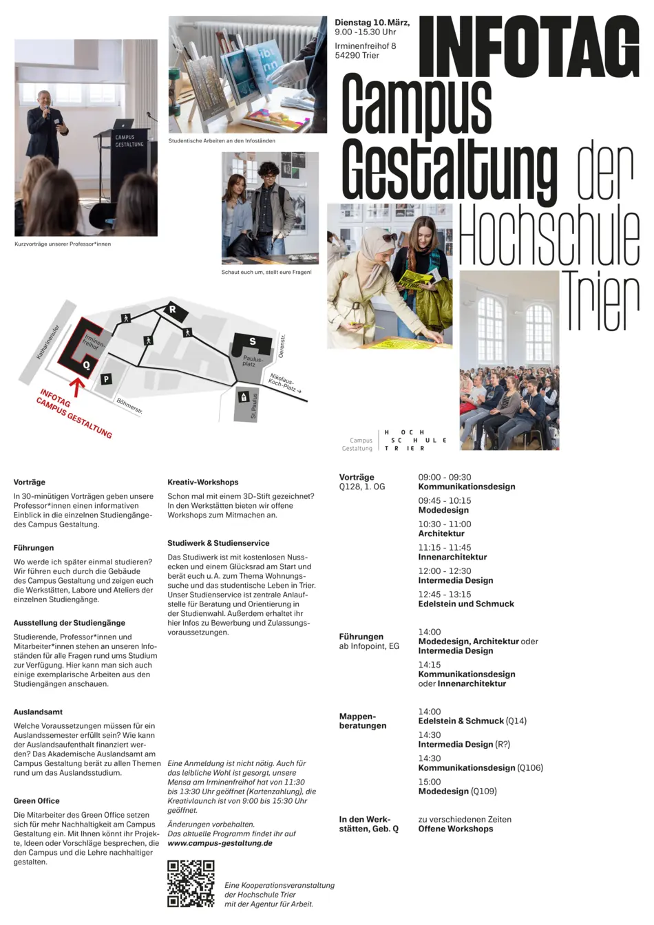 Am 10. März 2026 öffnet die Hochschule Trier wieder ihre Türen für alle Studieninteressierten. Gemeinsam mit der Agentur für Arbeit Trier lädt die Hochschule dazu ein, die vielfältigen Studienmöglichkeiten an den zwei Campus-Standorten – Hauptcampus und Campus Gestaltung – kennenzulernen.