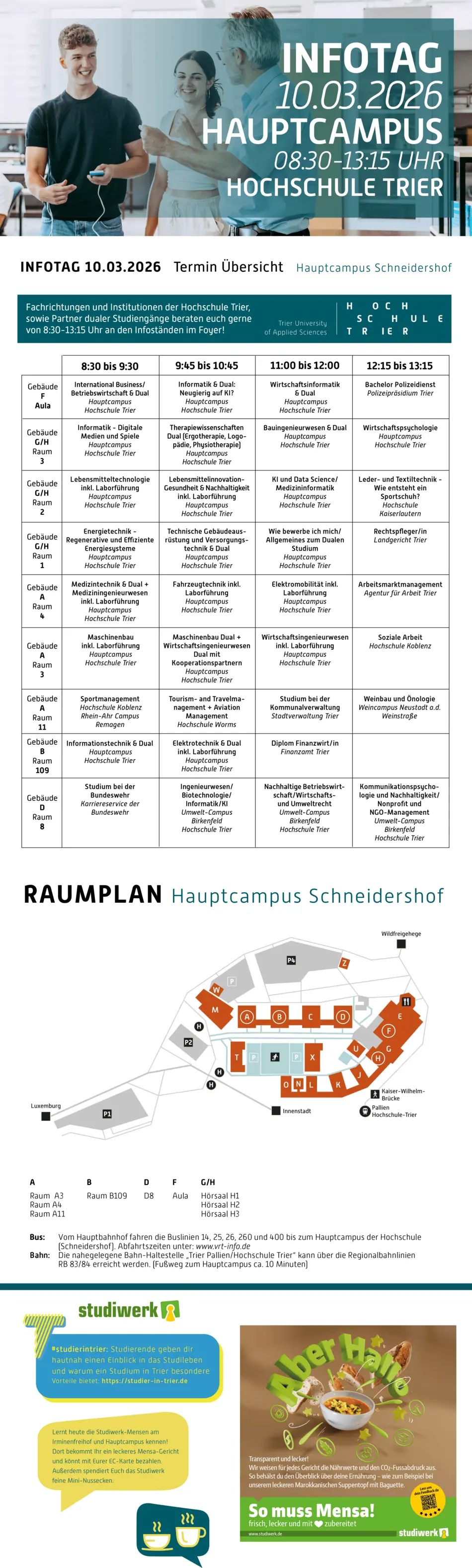 Der Infotag richtet sich an Schüler*innen der Oberstufe, die sich über ihre Studienoptionen informieren möchten. Besonders beliebt sind die praxisorientierten Studiengänge der Hochschule Trier, die sich durch enge Verknüpfung von Theorie und Praxis auszeichnen.