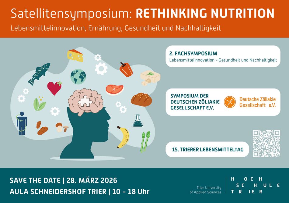 Passend zum neuen Bachelorstudiengang Lebensmittelinnovation – Gesundheit und Nachhaltigkeit lädt die Fachrichtung Lebensmitteltechnik der Hochschule Trier Studieninteressierte, Fachpublikum sowie weitere Gäste herzlich zum Satellitensymposium „Rethinking Nutrition" am 28. März 2026 ein. Die Veranstaltung findet im Rahmen des 15. Trierer Lebensmitteltags sowie des 2. Fachsymposiums statt und widmet sich den Schwerpunkten Lebensmittelinnovation, Ernährung, Gesundheit und Nachhaltigkeit.