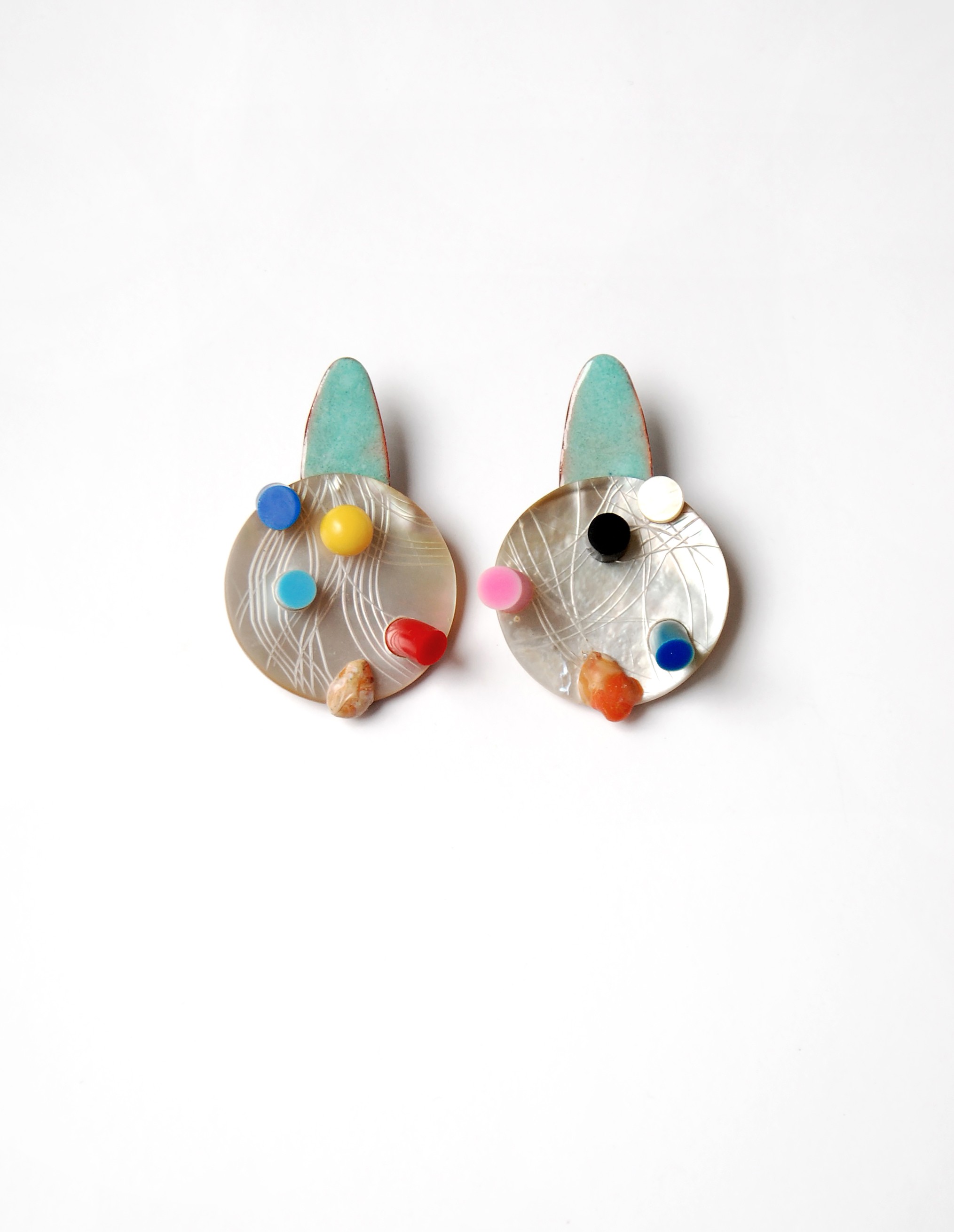 Mit earjewels – clownerie (2025) entwickelt Danni Schwaag (Dipl.) farbstarke, hybride Schmuckobjekte. Emaille, Perlmutt, Galalith und Kunststoff verbinden sich zu spielerischen, zugleich kritisch reflektierten Arbeiten über Körper, Inszenierung und Identität.