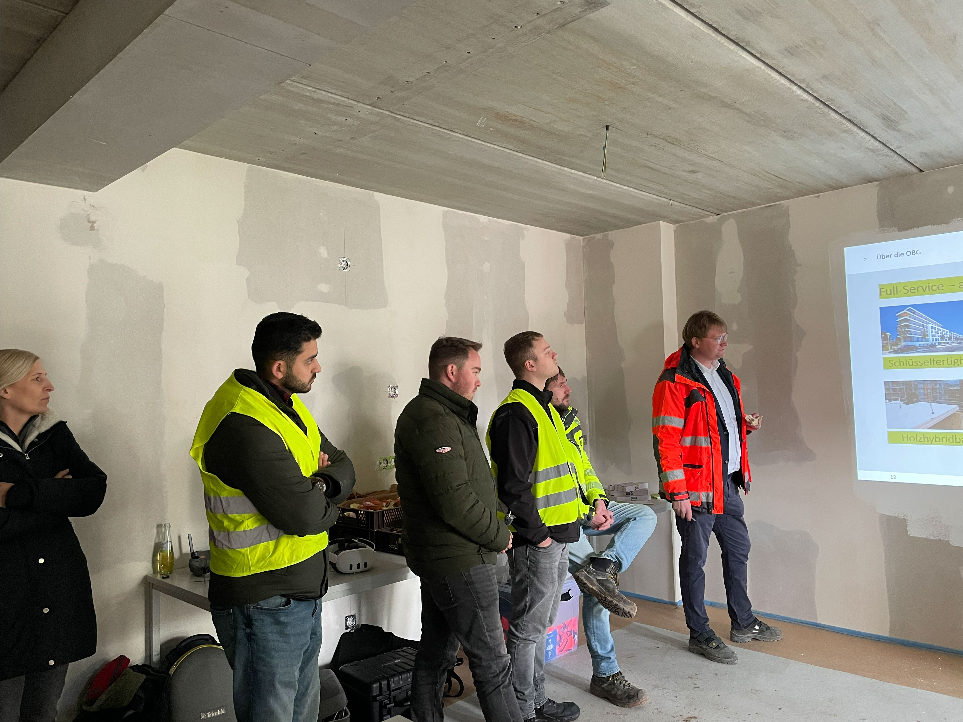 Die Masterstudierenden der Vertiefungsrichtung Baubetrieb besuchten eine Schlüsselfertigbau-Baustelle der Firma OBG Hochbau GmbH & Co. KG. Die Bauleitung gab einen kompakten Einblick in Projektorganisation, Bauablauf und die Koordination der Gewerke und führte die Gruppe über die Baustelle.