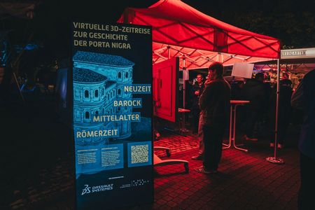 Den Auftakt bildeten zwei historische Projekte, die Vergangenheit und Technik miteinander verknüpften. Die Rekonstruktion des antiken Seehandels bot digitale Modelle antiker Schiffswracks und Handelsrouten und ermöglichte so einen lebendigen Einblick in die maritime Geschichte. Ergänzend dazu lud eine virtuelle 3D-Zeitreise dazu ein, die Porta Nigra in ihrer römischen Ursprungsform hautnah zu erleben und historische Details interaktiv zu entdecken.