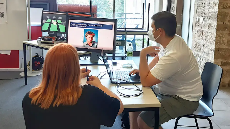 Aus den insgesamt acht interdisziplinären Anwendungsfeldern wurden sowohl Exponate im Foyer der Mensa als auch an drei weiteren Stationen gezeigt. Hohe Aufmerksamkeit erzeugte die Verkehrszählung mit KI (Prof. Dr. Roland Trapp), dargestellt durch eine sichtbare Erfassung des Besucherstroms auf einem großen Monitor.