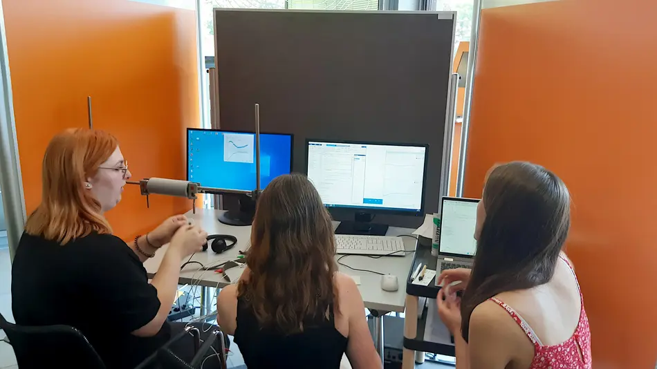 Die Aufmerksamkeit der Studierenden wurde anschließend zu weiteren Demonstratoren gelenkt, wie der hochfrequentierten Fahrt mit dem statischen Fahrsimulator (Prof. Dr. Jörn Schneider) und der Erfassung von Augenbewegungen anhand von Muskelströmen (Prof. Dr. Klaus Peter Koch). Außerdem wurden ein mobiler Roboter (Prof. Dr. Matthias Scherer), die Methodik von künstlichen puls-codierten neuronalen Netzen (Prof. Dr. Elmar Seidenberg) und der Reinforcement Learning Contest (Prof. Dr. Ernst Georg Haffner) vorgestellt.