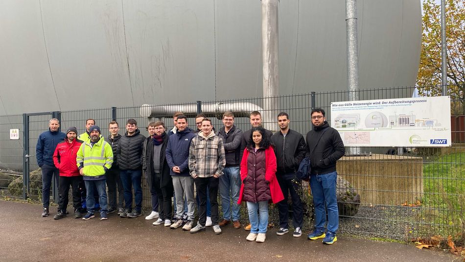 Der Besuch bot den Studierenden einen umfassenden Einblick in die einzelnen Prozessschritte der Biogasaufbereitung. Nach der der ersten Reinigung bei den Erzeugern gelangt das Gas zunächst in den Hauptspeicher mit einem Fassungsvolumen von 5300 m³. Dort wird das Gas – bestehend aus etwa 53 % Methan und 45 % Kohlendioxid – zwischengespeichert und homogenisiert.