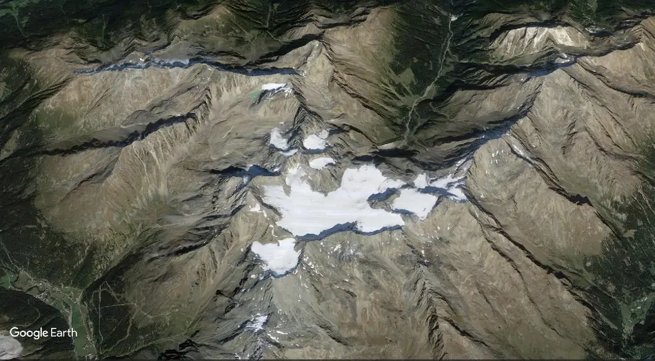 Extension of the Glacier seen by GoogleEarth. Data Acquisition: 24/09/2021. The Extension of the glacier fits very well with time series analysis of the Laaser Ferner visualized within the next video.