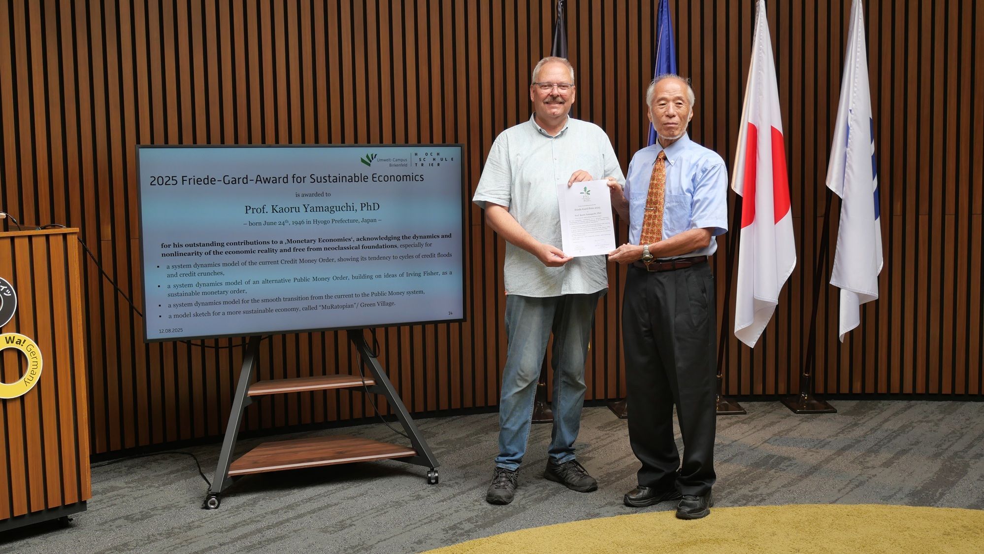 Am Samstag, den 18. Oktober 2025 erfolgt ab 9 Uhr im Rahmen der offiziellen Award Ceremony eine ausführliche Würdigung des Preisträgers. Zunächst wird Professor Dr. Joseph Huber das Konzept des Vollgeldes im Überblick vorstellen, gefolgt von einer Laudatio durch den Preisträger des Friede-Gard-Preises 2022, Steve Keen. In der Preisträgerrede wird Professor Yamaguchi sein Werk vorstellen und einen allgemeinverständlichen Einblick in seine Forschung gewähren.