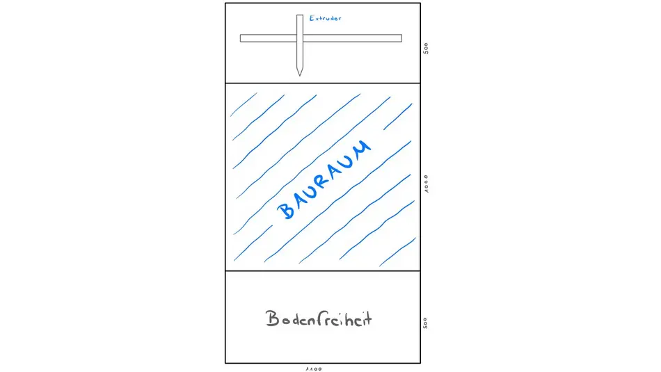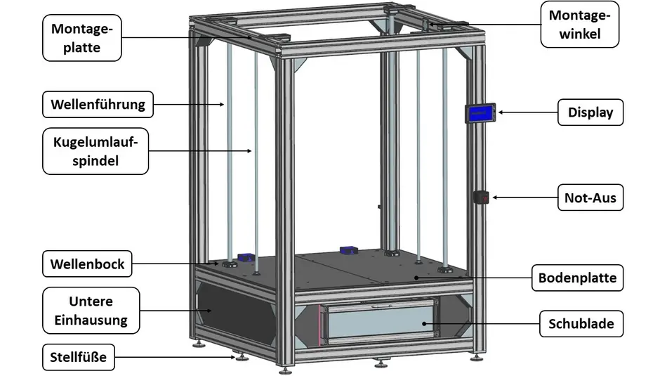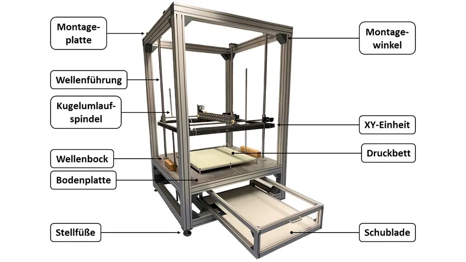 Ziel war es, einen funktionsfähigen Drucker aufzubauen, bei dem verschiedene Aufrüstungsmöglichkeiten bereits vorgesehen sind. So wurde der Drucker mit einem offenen Bauraum gebaut, allerdings ist die Nachrüstung einer Bauraumheizung sowie die Einhausung des Druckers vorgesehen.  In Abbildung 2 ist eine Übersicht des Gehäuses inklusive einer Schublade zur Unterbringung der Elektrik dargestellt.