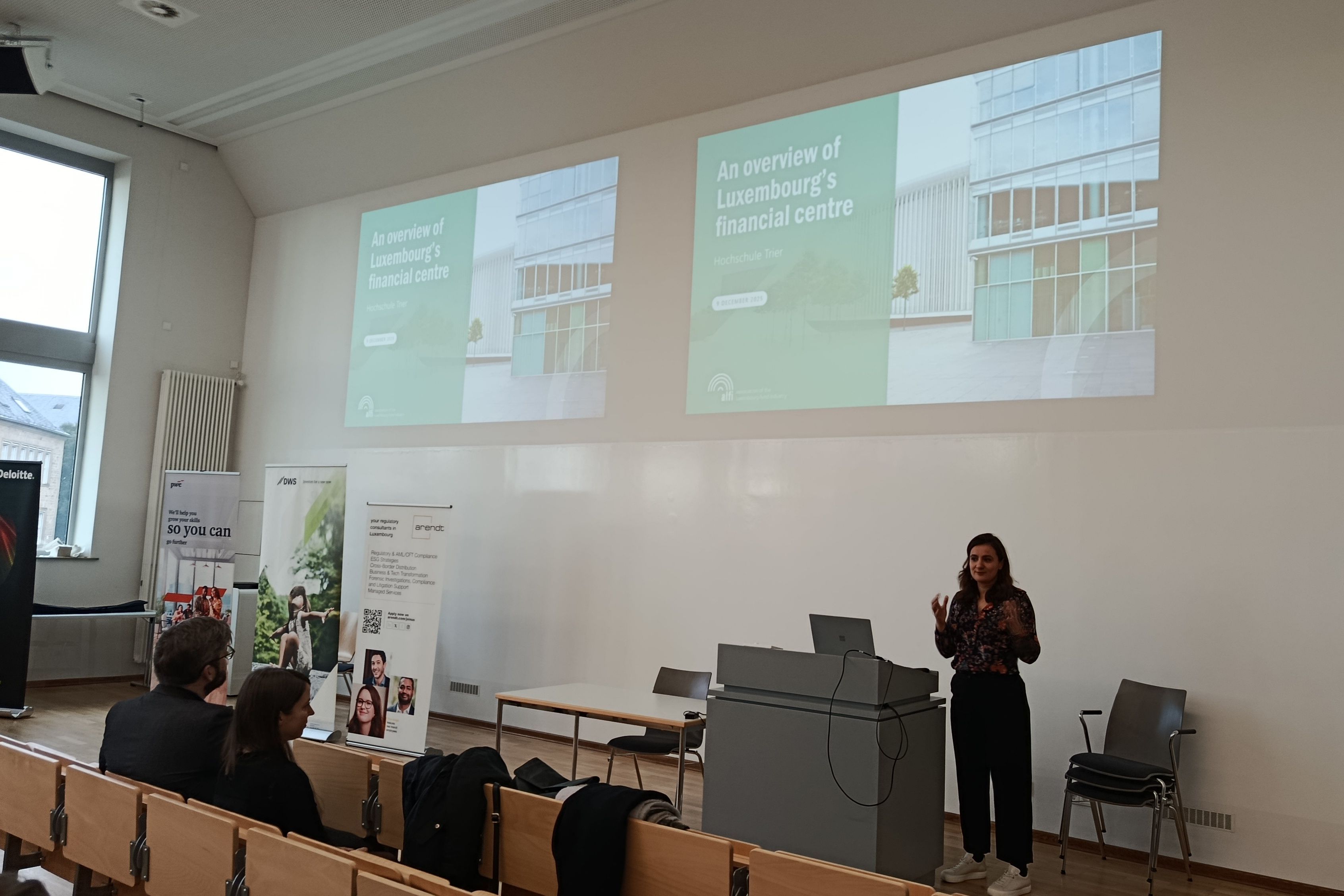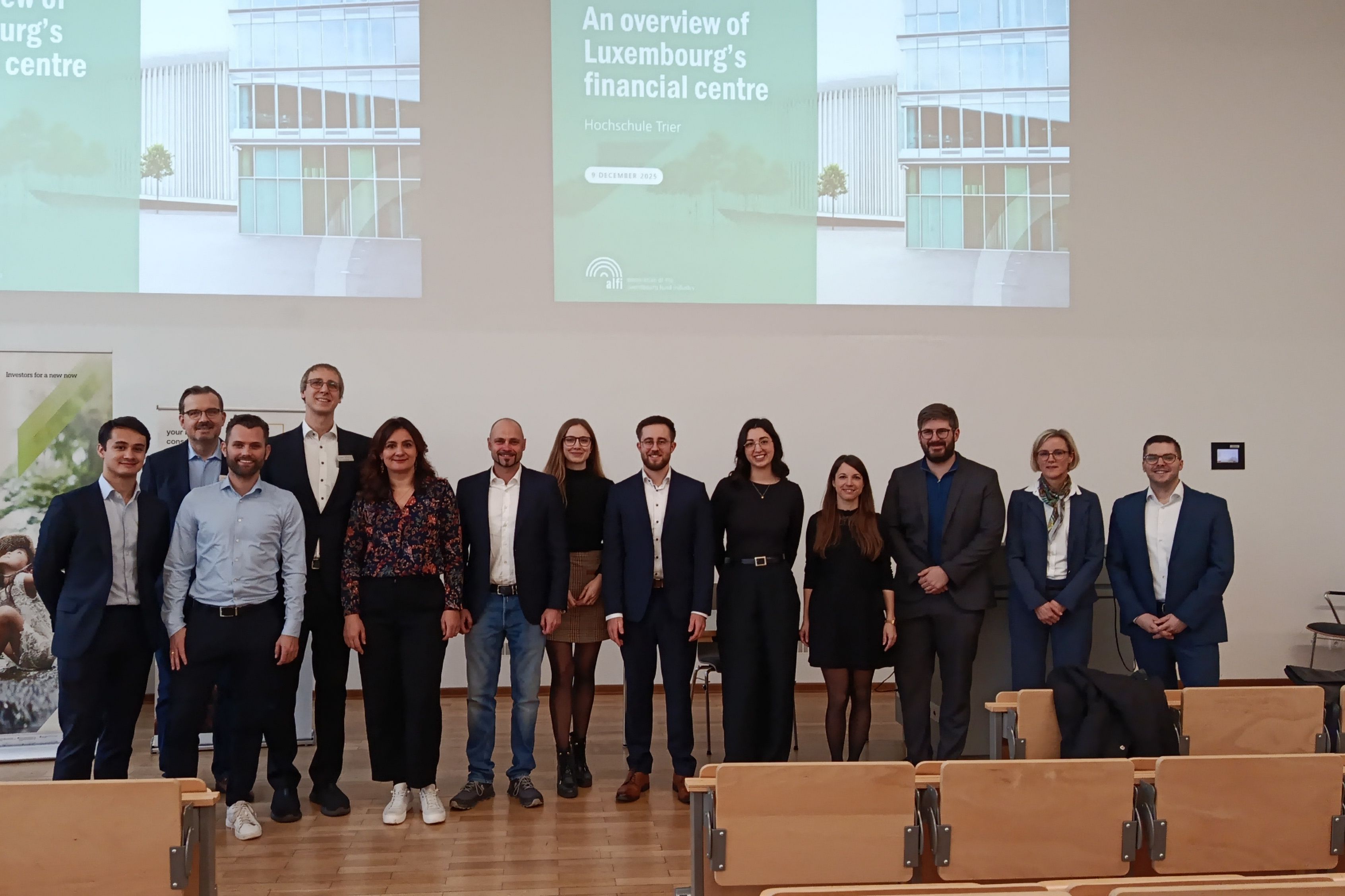 Vergangenen Dienstag hatten die Studierenden die besondere Möglichkeit, einen unmittelbaren Einblick in die Finanz- und Fondsindustrie Luxemburgs zu erhalten. Auf Initiative von Prof. Dr. Michael Hahn und Prof. Dr. Matthias Weimann hieß der Fachbereich Wirtschaft die Association Luxembourgeoise des Fonds d’Investissement (ALFI) im Hörsaal 3 der Hochschule Trier willkommen.