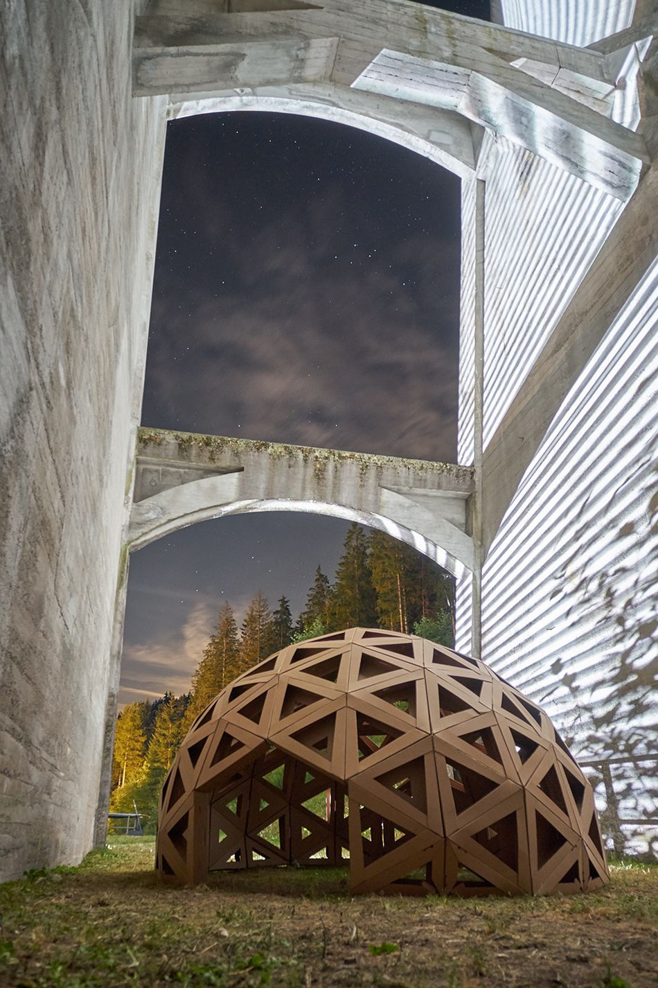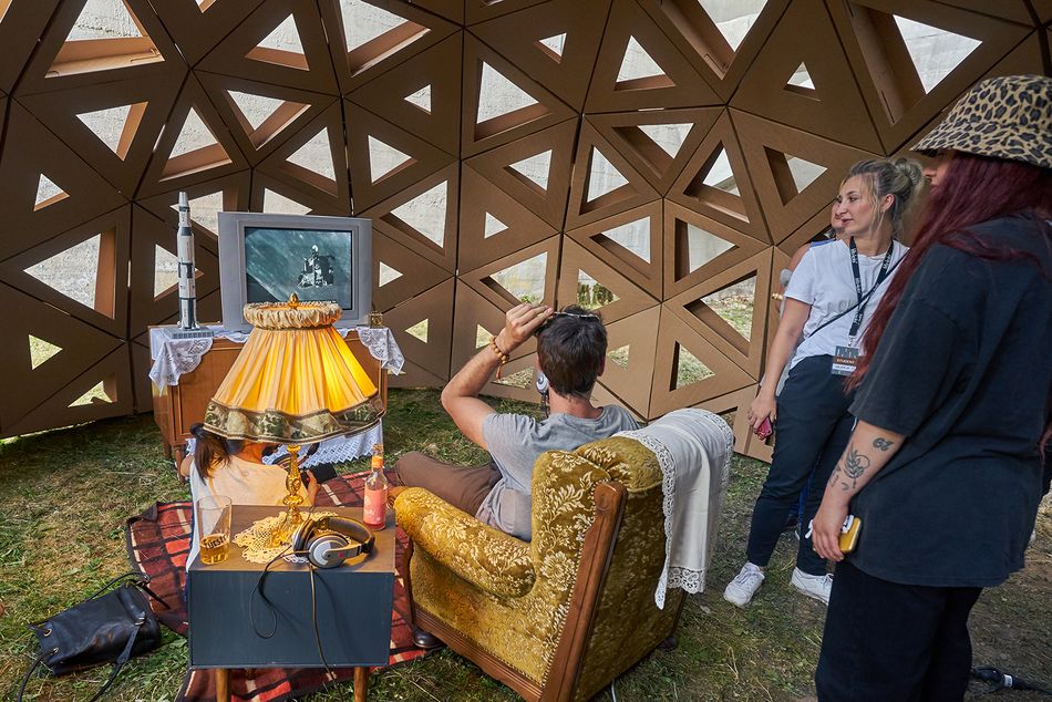 Im Rahmen der Kurse Künstlerisches Gestalten (Prof. Jörg Obergfell) und Konstruieren III (Prof. Martin Schroth) entwarfen Studierende im Sommersemester 2019 geodätische Kuppeln aus Pappe. Mit freundlicher Unterstützung von Brohl Wellpappe wurde eine der Konzeptionen realisiert und am 20. Juli auf dem Reservoir Festival für elektronische Musik an der Linachtalsperre gezeigt. Die 3 m hohe Konstruktion basiert auf dem ikonischen Design Buckminster Fullers. Während des Festivals diente sie als Hülle für eine interaktive Installation von Studierenden der HFU Furtwangen, die sich – aus Anlass des 50. Jahrestags –mit der ersten Mondlandung auseinandergesetzt hatten.