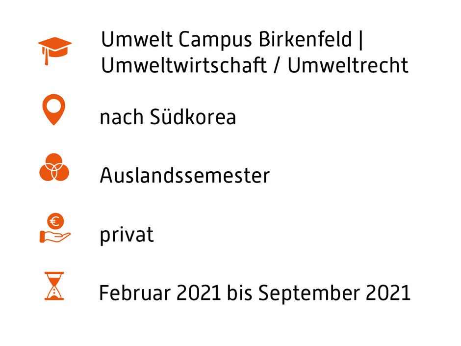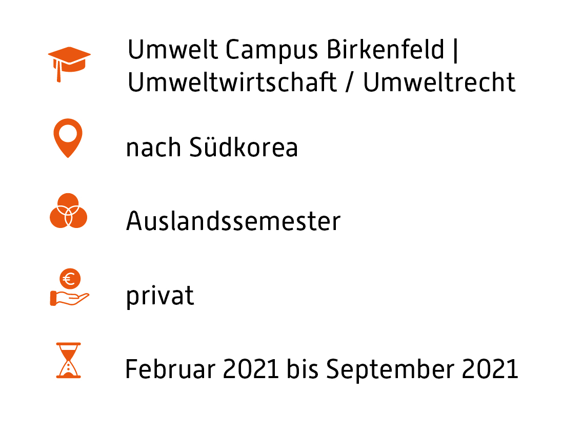 Am 08.02.2021 ging es endlich für mich los nach Korea. Doch bevor ich die Reise antreten konnte, musste ich aufgrund der Pandemie vieles vorbereiten. Da die meisten Länder aufgrund der besonderen Situation geschlossen haben, konnte man nur mit einem Arbeits- oder Studentenvisum einreisen. Dadurch, dass ich nicht in Seoul, sondern in Suwon studiere, habe ich mit meinen Mitstudenten die Quarantäne im Kyunghee University Dormitory verbracht. Am 23.02.2021 durfte ich die Quarantäne verlassen und nun kann mein Abenteuer in Korea richtig losgehen!