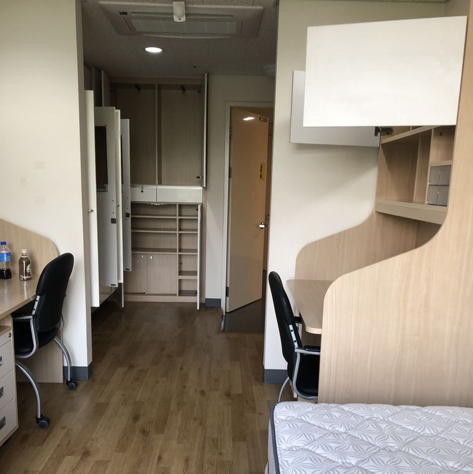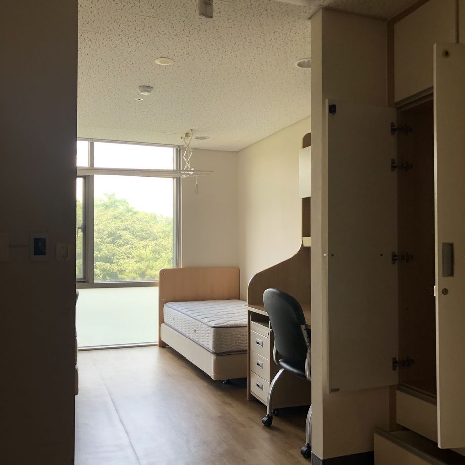 Das International Dormitory an der Ajou Universität ist das neuste und modernstes Wohnheim auf dem Campus. Es hat im Gegenzug zu den anderen Dorms einen Aufzug, Fitnessraum und einen Waschraum. Ursprünglich war geplant, aufgrund der Corona Krise, dass jeder sein eigenes Zimmer bekommt. Doch mit fallenden Zahlen wurde am letzten Tag in der Quarantäne von dem Universitätspräsidenten entschieden, dass wir unser Zimmer doch teilen mussten, da Platzmangel herrscht, aber als kleines Entgegenkommen durften wir unseren Mitbewohner/in aussuchen. In Korea ist es üblich, dass man sich ein Zimmer mit einer weiteren Person teilt. Das Zimmer besteht aus einem Bett, Schreibtisch, Stuhl und Kommoden für Schuhe und Klamotten. In jedem Stock gibt es auf jeder Seite Gemeinschaftstoiletten und Gemeinschaftsbäder, die täglich zweimal am Tag gereinigt werden. Zum Kochen gibt es Gemeinschaftsküchen, sowie Gemeinschafträume zum Lernen. Eine Besonderheit in Korea, die uns etwas „altmodisch“ vorkommen könnte ist, dass die Etagen nach Geschlechtern geteilt sind. Im 2.-4. Stock waren für Studenten und 5-8. Stock für Studentinnen. Alles im Dorm ist nach Geschlechtern geteilt, sogar die Küchen, Gemeinschafträume und sogar die Waschräume. Durch die Geschlechterteilung ist es fast unmöglich Teamworks zu machen, weshalb man dafür raus in ein Café ausweichen muss.