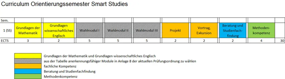 Die Wahlmodule I bis III, das Modul Projekt sowie das Modul Vortrag, Exkursion sind Veranstaltungen, die direkt dem Kennenlernen bestimmter Fachrichtungen dienen sollen. Dabei werden die Teilnehmenden am Orientierungssemester in den Wahlmodulen I bis III zusammen mit den regulären Studierenden an diesen Modulen teilnehmen und in den anderen beiden Modulen speziell für Smart Studies konzipierte Veranstaltungen besuchen.