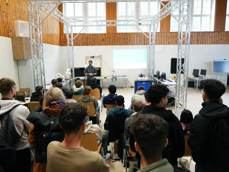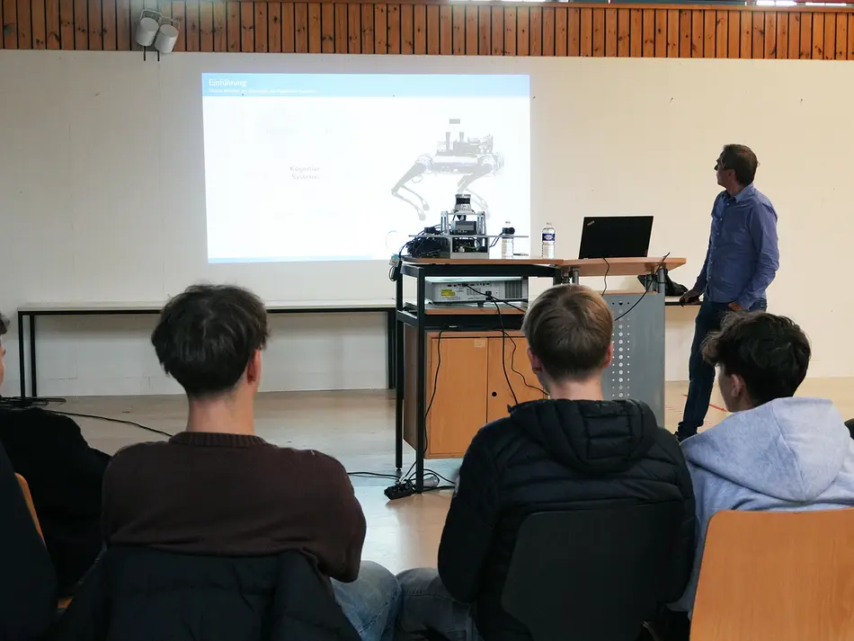 Prof. Dr. Jürgen Graf widmete sich in seinem Workshop den wichtigen Themen der kognitiven Systeme am Beispiel mobiler, autonomer Roboter. Hierbei wurden die Themenschwerpunkte Navigation, KI und Robotik beleuchtet. Zum Highlight des Tages durften die Studierenden auch selbst die Kontrolle über einen unserer Roboterhunde übernehmen.