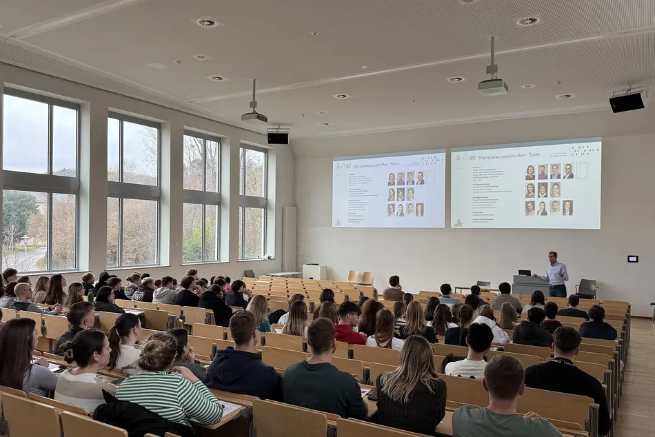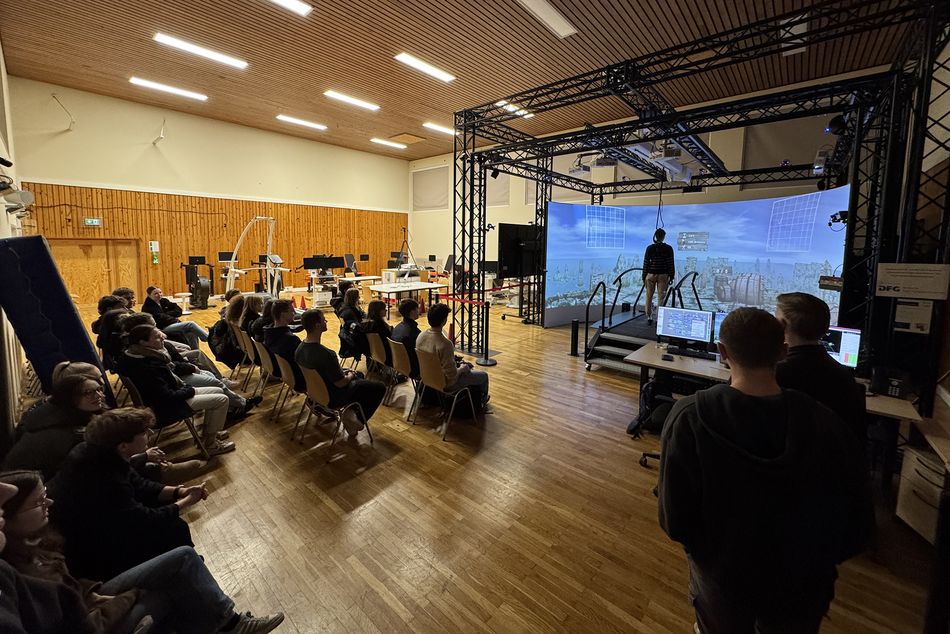 Prof. Dr. Steffen Müller, Studiengangleiter, und Prof. Dr. Sven Karstens, Professor für Physiotherapie, gaben den Interessierten sowohl einen allgemeinen Überblick als auch vertiefende Einblicke in Studieninhalte, Studienorganisation und berufliche Perspektiven. Frau Faber aus dem Studienservice unterstützte das Team mit Informationen zum Bewerbungsprozess und beantwortete Fragen der Schülerinnen und Schüler zu den Zulassungsvoraussetzungen. Im Rahmen von Campus- und Laborführungen lernten die Teilnehmenden in Kleingruppen zudem die moderne Lehr- und Forschungsinfrastruktur der Fachrichtung Therapiewissenschaften kennen. Besichtigt wurden unter anderem das Therapiewissenschaftliche Test- und Trainingszentrum mit den Laboren für Trainingstherapie und biomechanische Funktionsdiagnostik.