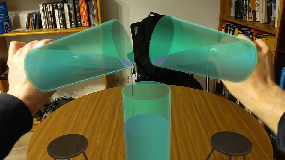 An der Schnittstelle zwischen VR/AR/XR, Cloud Computing und Internet of Things zeichnet sich eine technische Revolution ab, die häufig unter dem Schlagwort Metaversum zusammengefasst wird. Diese ermöglicht eine virtuell erweiterte physische Realität, in der man als Individuum in virtuellen 3D-Räumen agieren kann. Die auf der Hannover Messe vorgestellte AR Demonstration der Simulation des Umganges Flüssigkeiten balanciert physikalischen Realismus einerseits und Benutzbarkeit andererseits.