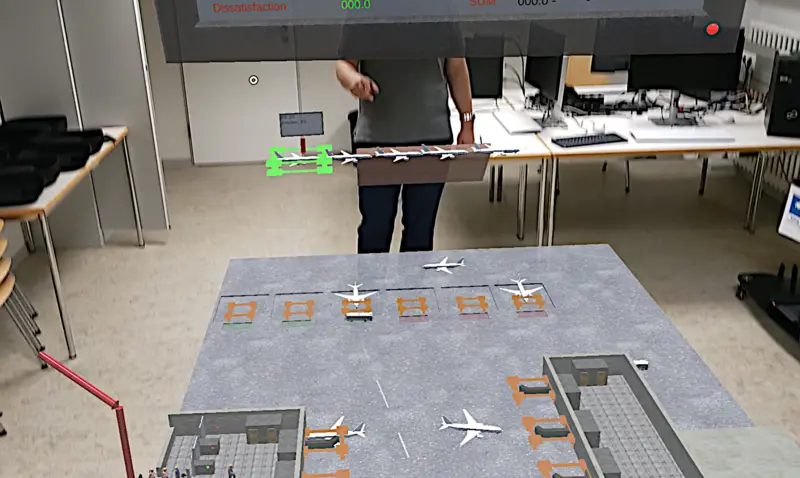 Airport Collaboration ist eine co-located XRSimulation, die ein semi-kooperatives Serious Game zum Thema Total Airport Management darstellt. Eine co-located XR Simulation ist eine vernetzte Simulation zwischen verschiedenen Headsets (in diesem Falle HoloLens 2 und Quest Pro), die zwischen verschiedenen Teilnehmern am gleichen physikalischen Ort stattfindet. In unserem Falle dient ein PC als Server, um die eigentliche Simulation auszuführen.