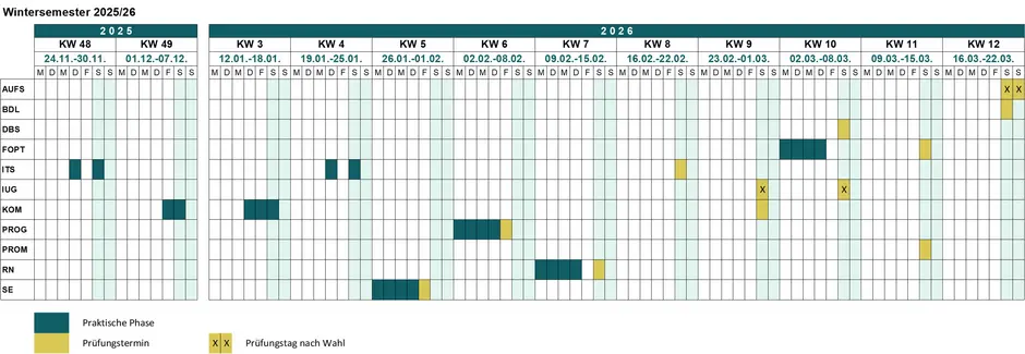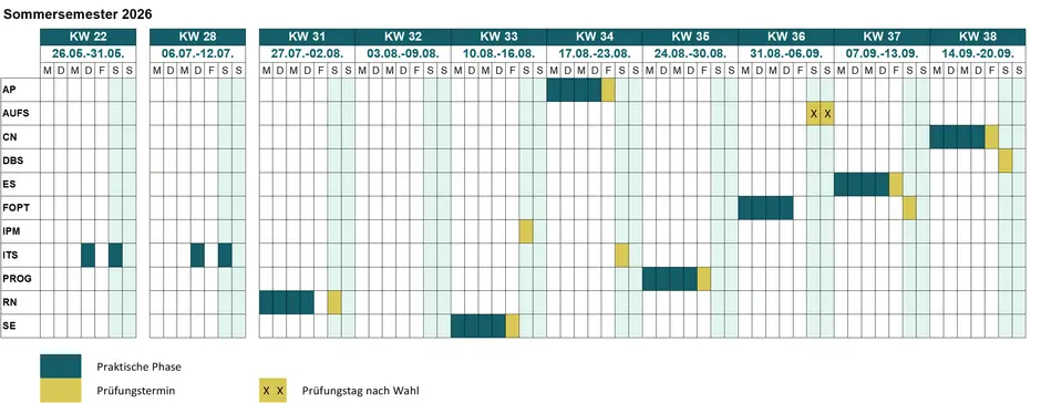 Ausführliche Informationen zu den einzelnen Modulen finden Sie auf den Modulseiten. Bitte beachten Sie, dass die konkreten Termine für Tutorien, praktische Phasen, Prüfungen usw. erst kurz vor Kursbeginn bekanntgegeben werden können. Darüber hinaus behalten wir uns kurzfristige Änderungen der Durchführung vor.