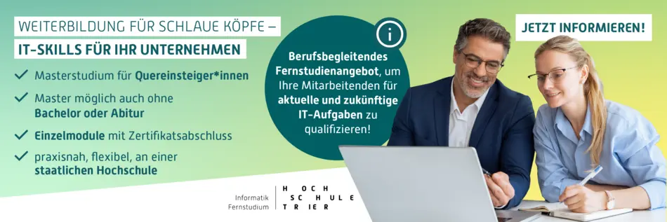 In diesem Sinn möchten wir Sie auf das Fernstudium Informatik als passgenaue, berufsbegleitende Weiterbildungsmöglichkeit für Ihre IT-Mitarbeiter*innen aufmerksam machen.