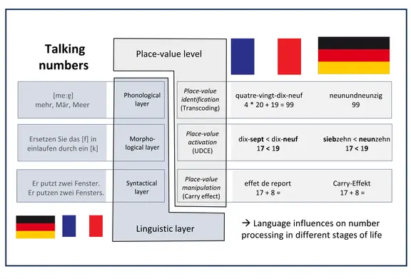 In dem DFG-geförderten Projekt Talking Numbers werden diese Beziehungen auf Verhaltens-, neurofunktioneller (fMRT) und neurostruktureller Ebene (MRT mit uni- und multivariatem Lesion-Behavior Mapping sowie Disconnectome Mapping) bei französisch- und deutschsprachigen Personen an der Sorbonne Universität Paris, der Universitätsklinik Tübingen und der Hochschule Trier untersucht. Dies ermöglicht einen direkten Vergleich beider Zahlwortsysteme. Es werden drei Altersgruppen (d.h. Kinder, Erwachsene und Ältere) eingeschlossen, um Erkenntnisse über altersbedingte Veränderungen der Spracheinflüsse auf die Zahlenverarbeitung zu gewinnen. Zudem werden die Auswirkungen typischer und beeinträchtigter Sprachverarbeitung (d.h. bei Kindern mit und ohne Sprachentwicklungsstörungen und nach Schlaganfall) untersucht.