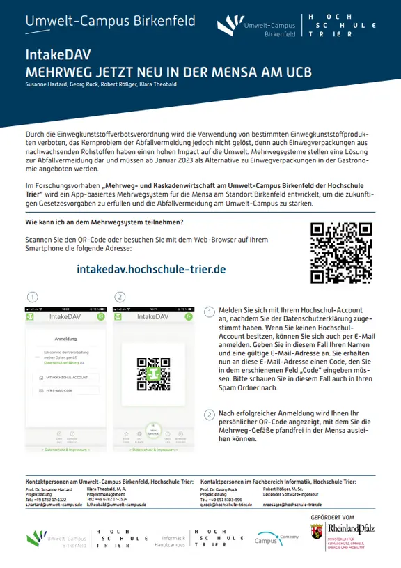 Wir freuen uns sehr Sie darüber zu informieren, dass das neue Mehrweg-System IntakeDAV in der Mensa in Birkenfeld seit dem 01.09.2022 erfolgreich eingesetzt wird. Wer sich für die aktuellen Ausleihstatistiken interessiert, kann diese in der App IntakeDAV unter DAV Punkte > Community live verfolgen. Seit 09.01.2023 wurde zudem der Probebetrieb in der Mensa am Hauptcampus gestartet. Die Nutzung der Applikation ist denkbar einfach realisiert und ermöglicht eine einfache Übersicht über die ausgeliehenen Bowls und gibt unter anderem auch die Möglichkeit die Ausleihdauer einmalig zu verlängern. Zum Anmelden in der App wird lediglich der Hochschul-Account benötigt. Das Essen-to-go kann nun in einer wiederverwendbaren Mehrweg-Bowl bestellt werden, welche nach der Rückgabe in der jeweiligen Mensa gereinigt wird und somit wieder zur Ausleihe zur Verfügung steht. Die Zahlung eines Pfandbetrags ist hierbei nicht notwendig. Details zur Verwendung der Applikation IntakeDAV finden Sie auch auf der Videoplattform der Hochschule Trier.