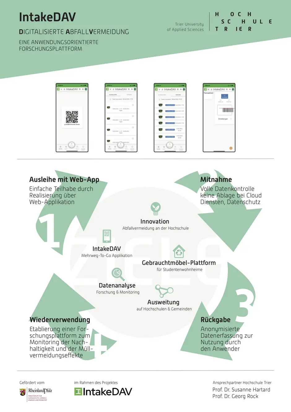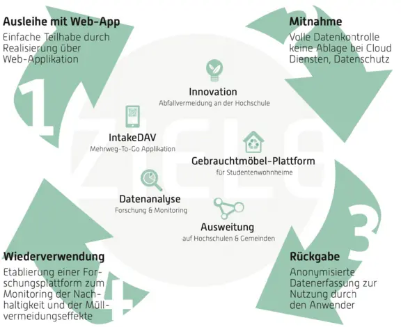 Das Forschungsvorhaben „Mehrweg- und Kaskadenwirtschaft am Umwelt-Campus Birkenfeld der Hochschule Trier“ zielt auf die substanzielle Verbesserung und Innovation im Bereich der Abfallvermeidung an einem Hochschulstandort. Als Modellstandort wird der Umwelt-Campus Birkenfeld der Hochschule Trier gewählt. Ziel des Forschungsprojektes ist es, im Bereich der Mensa und Studentenwohnheime das Abfallaufkommen spürbar zu reduzieren. Die Vermeidungsstrategie zielt dabei auch auf die Nutzung attraktiver digitaler Tools, sodass im Projekt auf zwei Strecken geforscht und entwickelt wird: