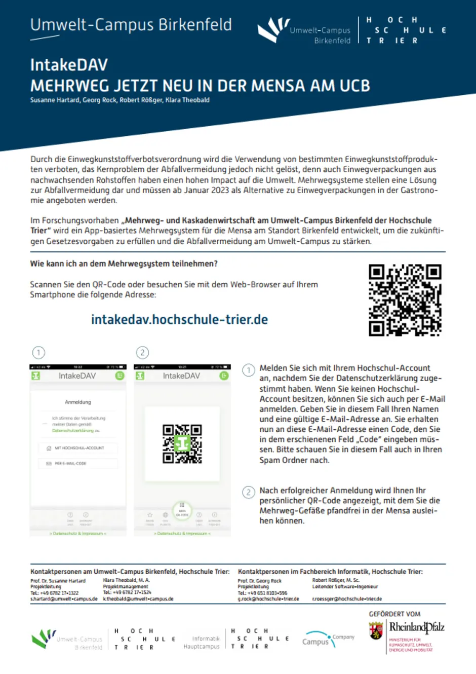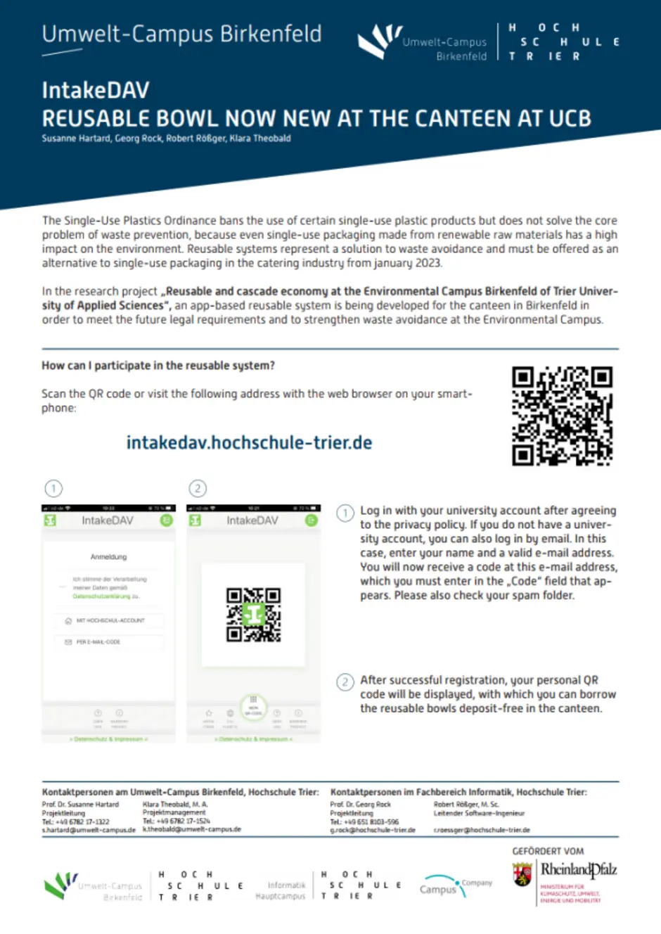 Im Forschungsvorhaben „Mehrweg- und Kaskadenwirtschaft am Umwelt-Campus Birkenfeld der Hochschule Trier“ (gefördert vom Ministerium für Klimaschutz, Umwelt, Energie und Mobilität Rheinland-Pfalz) wird ein App-basiertes Mehrwegsystem für die Mensa am Standort Birkenfeld entwickelt. Mit Hilfe der Web-App IntakeDAV kann das Essen-to-go in einer wiederverwendbaren Mehrweg-Bowl ausgegeben werden.