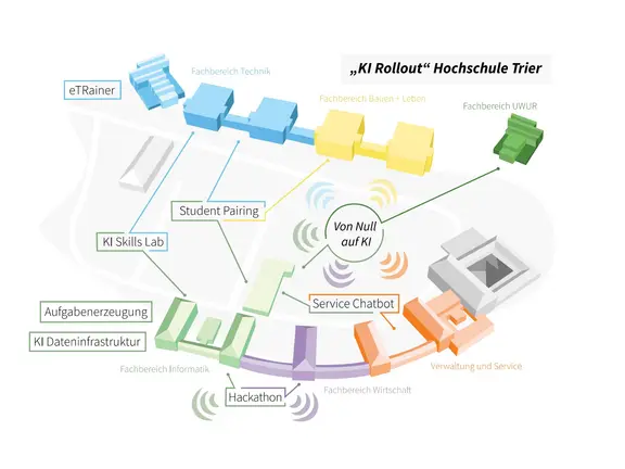 Das Projekt KI Rollout setzt durch ein Bündel abgestimmter Maßnahmen und ausgehend von der vorhandenen KI-Expertise im Fachbereich Informatik der Hochschule Trier die Qualifizierung von zukünftigen akademischen Fachkräften im Bereich KI und die Nutzung von KI-Technologien in der Hochschulbildung um.