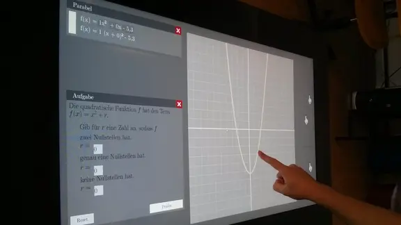 Auf dem Tisch werden mathematische Funktionen dargestellt, die mit der Hand verschoben oder verändert werden können. Gleichzeitig können an der ebenfalls angezeigten Formel die Änderungen der Werte in dieser Formel verfolgt werden.