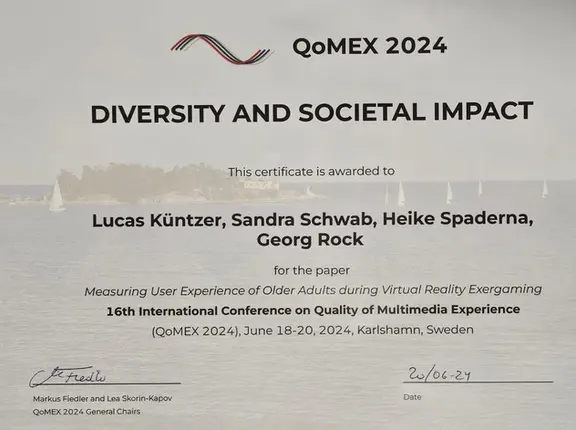 Lucas Küntzer, Sandra Schwab, Heike Spaderna and Georg Rock: Measuring User Experience of Older Adults during Virtual Reality Exergaming. In: 16th International Conference on Quality of Multimedia Experience (QoMEX 2024). pp. 1–7. IEEE, Karlshamn, Sweden, 2024. (to appear)