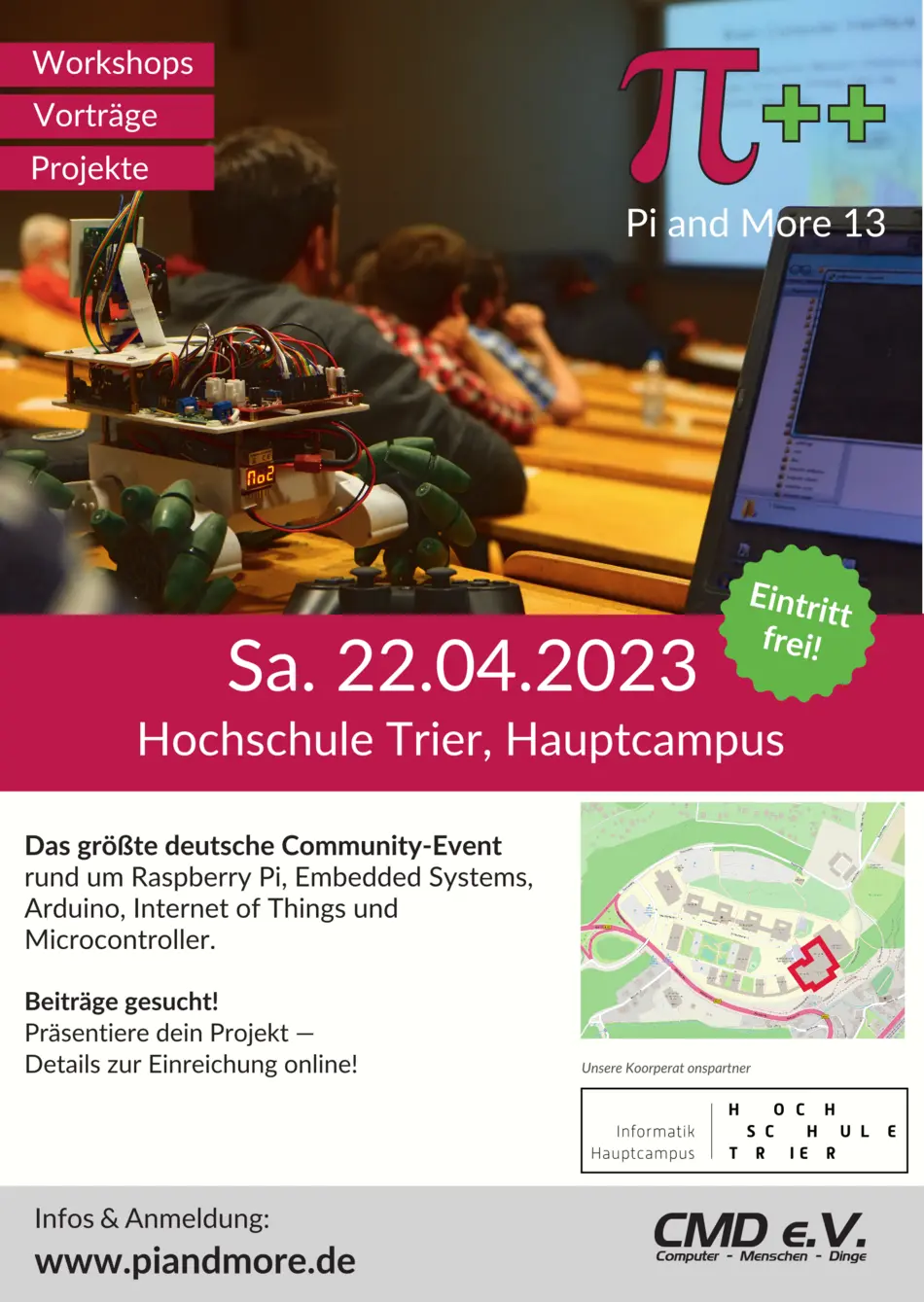 Pi and More 13 wird ausgerichtet vom CMD - Computer, Menschen, Dinge e.V. Trier in Zusammenarbeit mit dem Fachbereich Informatik der Hochschule Trier. Die Veranstalter rechnen mit bis zu 300 Besucherinnen und Besuchern.