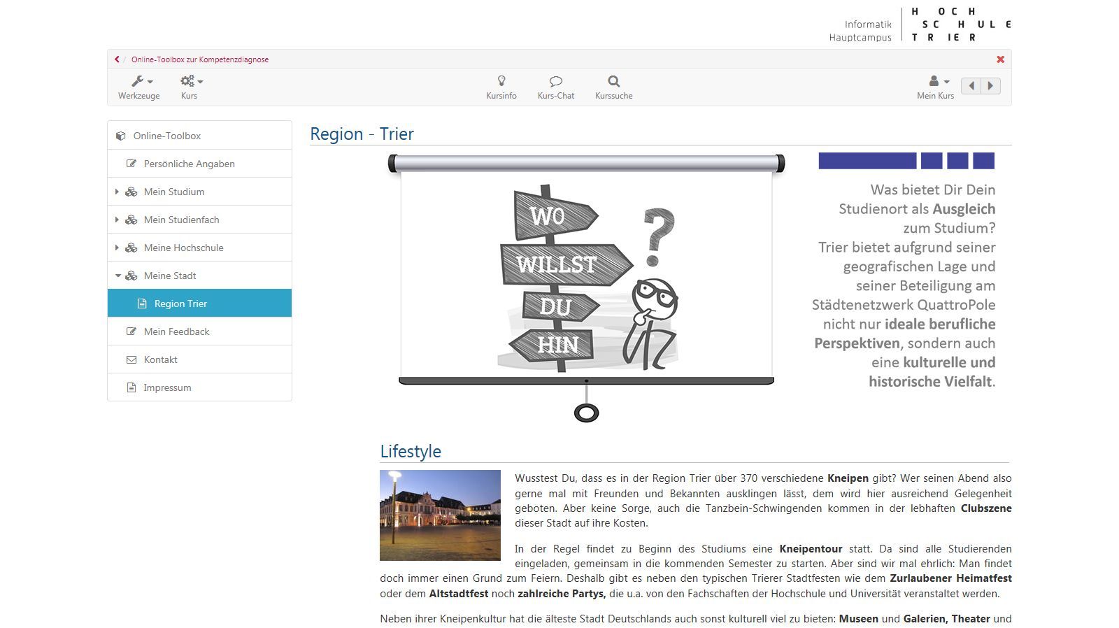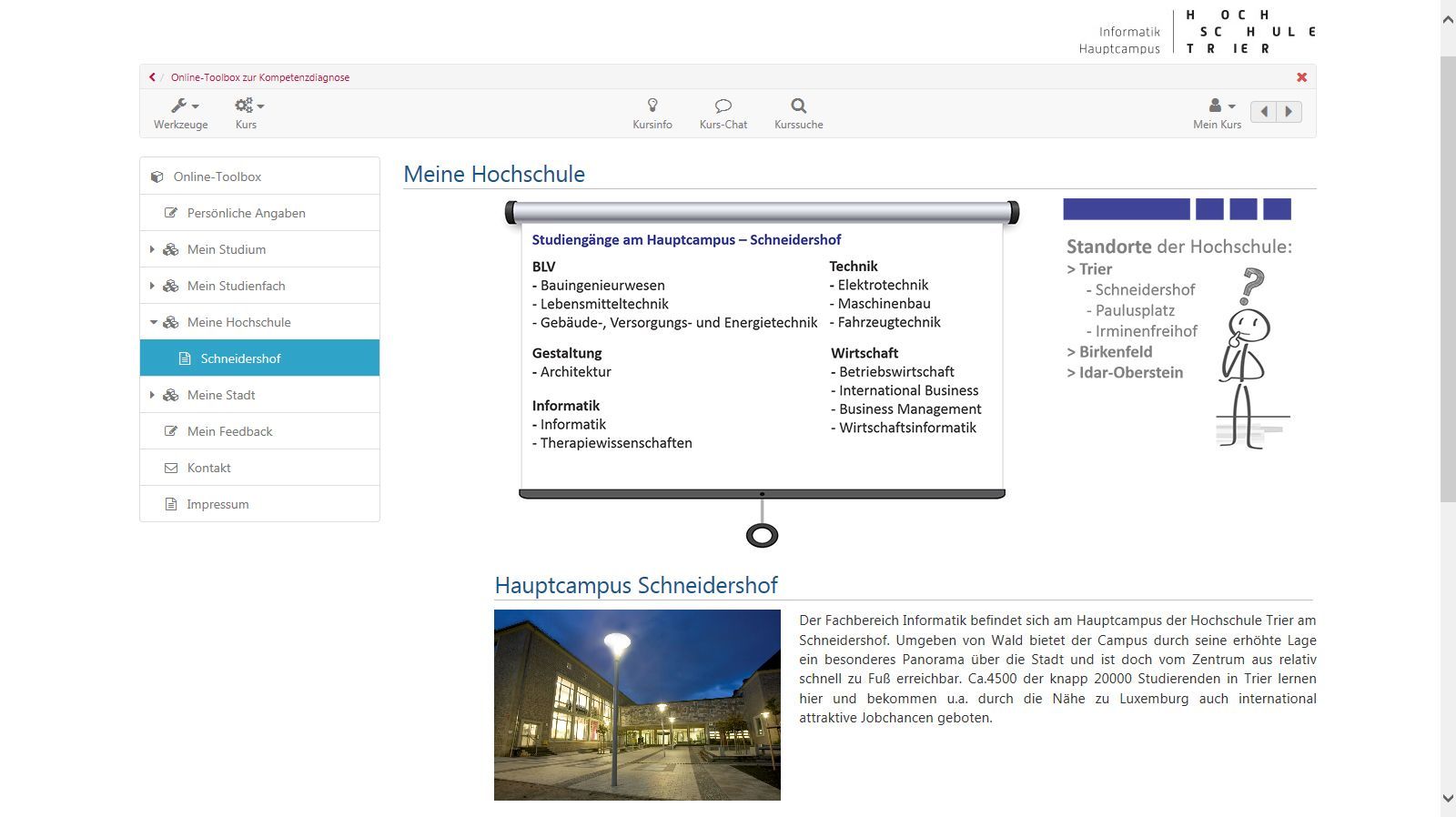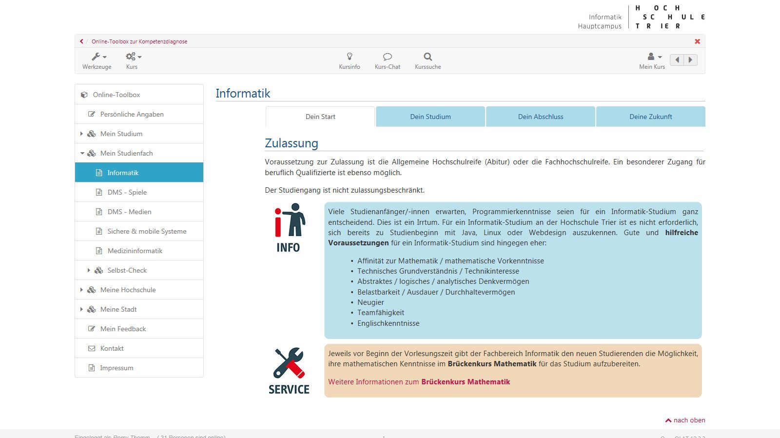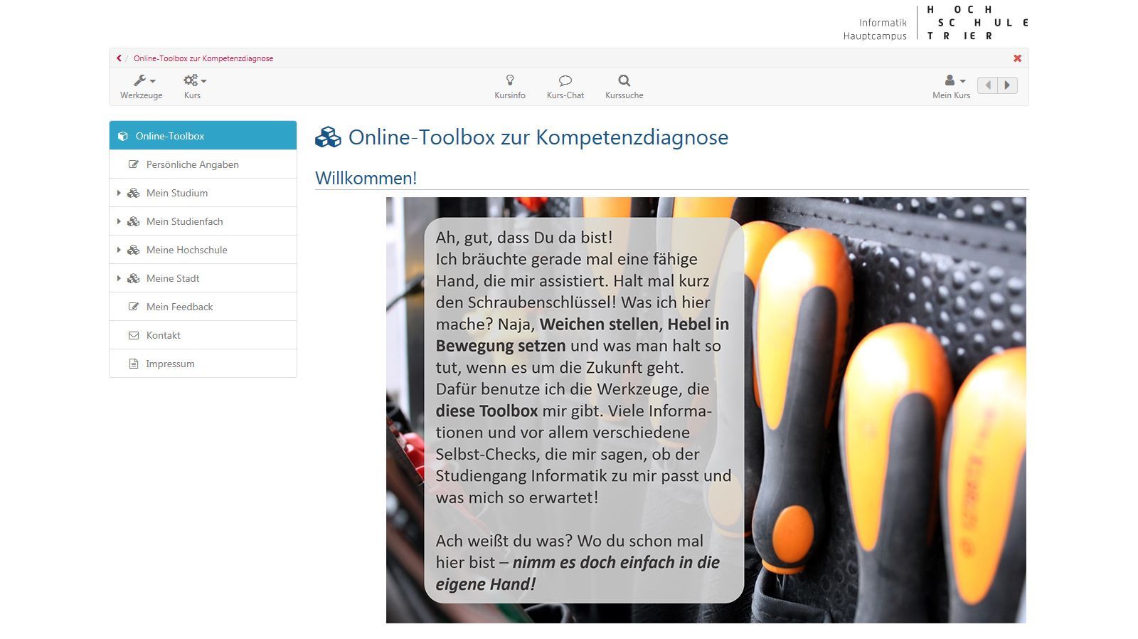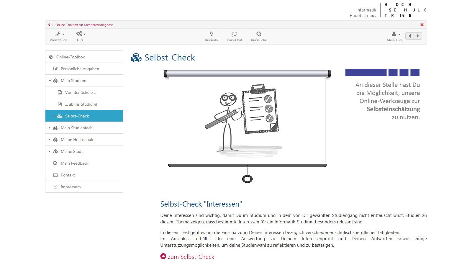 Seit dem Sommersemester 2018 gibt es ein neues Werkzeug für Dich als Studienanfänger/-in. Wir haben für Dich eine Online-Toolbox in der Lernplattform OpenOLAT entwickelt. Diese Toolbox kann sowohl zur Information zu wichtigen Themen genutzt werden. Sie ist aber auch ein Instrument, mit dem Du Deine Kompetenzen und Interessen hinsichtlich eines Informatik-Studiums in verschiedenen Selbst-Checks überprüfen kannst. Wenn Du diese Selbst-Checks bearbeitest, bekommst Du ein persönliches Feedback und ganz gezielt passende Tipps und Handlungsempfehlungen, um gewisse Fragen und Unsicherheiten zu klären und um Dich dabei zu unterstützen, die Weichen für ein erfolgreiches Studium optimal zu stellen.