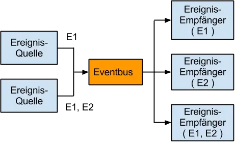 An diesem Punkt setzt das Entwurfsmuster Eventbus an. Auch mit diesem kann man das Entwurfsmuster Observer umsetzen. Im Wesentlichen stellt ein Eventbus eine zentrale Ereignis-Quelle zur Verfügung, an denen sich Observer für Ereignisse anmelden können und bei entsprechendem Auftreten informiert werden. Gleichzeitig dient es Komponenten als zentrale Stelle, über die Ereignisse publik gemacht werden. Typischerweise existiert in einer Applikation nur genau ein Eventbus, der von allen Komponenten verwendet wird. So bietet es sich an, den Zugriff als Singelton zu implementieren. Daraus resultiert eine erhebliche Reduzierung des Implementierungsaufwands, da nicht mehr für jedes Modell eine Listener-Verwaltung geschrieben werden muss, was auch die Fehleranfälligkeit reduziert.