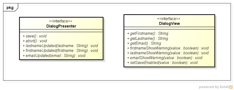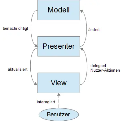 Das Entwurfsmuster MVP ist nun so aufgebaut, dass sich View und Presenter jeweils kennen. Die View enthält ausschließlich die GUI-Komponenten, während der Presenter die zugehörige Logik enthält. Welche Methoden zur Kommunikation zur Verfügung gestellt werden müssen, wird durch zwei Interfaces festgelegt und kann aus den gesammelten Aktionen von Benutzer und GUI abgeleitet werden (s. oben).