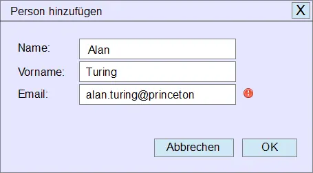 Angenommen, es soll eine Anwendung geschrieben werden, mit Hilfe der Personen verwaltet werden können. Betrachten wir den Dialog, bei dem ein neuer Benutzer hinzugefügt werden kann (s. Abbildung rechts). Nachdem die Personendaten korrekt eingegeben wurden, kann der Benutzer auf OK klicken, um den Eintrag zu übernehmen, oder auf Abbrechen, um den Vorgang zu beenden. Außerdem wird das Feld Email auf syntaktische Korrektheit überprüft und alle Felder dürfen nicht leer sein. Das Ergebnis der Feldprüfung wird jeweils dahinter mit Hilfe eines Icons angezeigt. Außerdem soll der Button OK nur gedrückt werden können, wenn alle Eingaben korrekt sind.