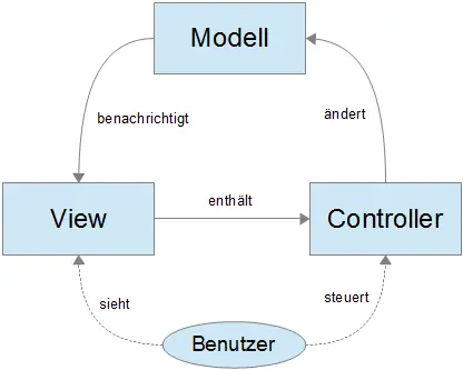 MVC ist ein Entwurfsmuster zur Strukturierung einer Software mit dem Ziel, später notwendig werdende Änderungen oder Erweiterungen zu vereinfachen und einzelne Teile wiederverwendbar werden zu lassen. Es setzt sich zusammen aus einem sogenannten Model (Datenhaltung und je nach Variante auch Geschäftslogik), einem Controller (Entgegennahme und Auswertung der Benutzereingaben) sowie einer View(Präsentation der Daten). Das Konzept sieht vor, dass der Controller Datenänderungsanfragen an das Modell weitergibt, dieses wiederum nimmt seinerseits die Änderung vor und benachrichtigt alle Views, die sich für eine Datenänderung des Models interessieren. Dazu können sich beliebig viele Views an dem Modell als Listener anmelden.