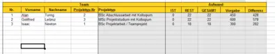 Hier werden alle Teammitglieder aufgelistet, die an dem Projekt beteiligt sind. Jedes Teammitglied erhält eine Nummer, mit deren Hilfe es an anderer Stelle eindeutig identifiziert wird. Hier ist ersichtlich, nach welchem Projekttyp laut Curriuculum das Teammitglied arbeitet, wie viele Stunden es bereits investiert hat und wie viele Stunden noch ausstehen. Diese Informationen werden automatisch anhand der Zeiterfassung im Projektplan errechnet.