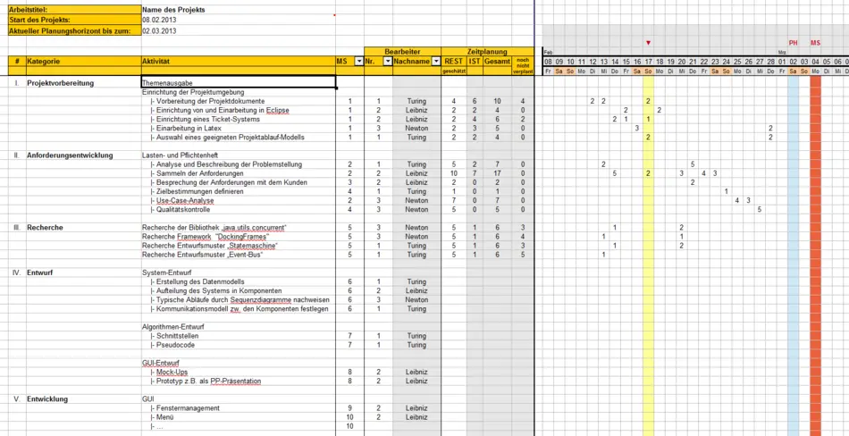 Um einen schnellen Einstieg zu ermöglichen, bieten wir hier einen Muster-Projektplan in Form eines OpenOffice-Calc-Sheets an. Auf diese Weise lassen sich einige Aufgaben der Projektplanung automatisieren und wichtige Informationen können direkt berechnet und übersichtlich dargestellt werden. Einige Zellen des Dokuments sind mit Hilfe der eingebauten Kommentar-Funktion erläutert, was jedoch für eine sinnvolle Nutzung möglicherweise noch nicht ausreicht. Aus diesem Grund wird im Folgenden eine Bedienungsanleitung gegeben, die den Einstieg so weit wie möglich erleichtern soll.