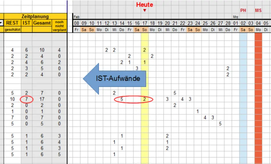 Die meisten Punkte erklären sich von selbst, während der letzte jedoch etwas mehr Erläuterung verdient. Im Kalender kann pro Arbeitspaket eingetragen werden, wie viel Zeit bereits dort hinein geflossen ist (IST-Aufwand). Dieser ergibt sich aus der Summe der Stunden von Beginn des Projekts bis zum jeweils aktuellen Tag. Der geschätzte REST-Aufwand gibt an, wie viele Stunden schätzungsweise noch für das Arbeitspaket aufgewandt werden müssen. Diese Zahl kann dann über den Planungshorizont verteilt werden, wobei es nicht zwingend notwendig ist, alle Stunden sofort zu verplanen.