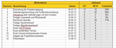 Auf diesem Datenblatt werden die Meilensteine verwaltet, die das Projekt in kleinere Ziele unterteilt. Jeder Meilenstein erhält eine Nummer, eine Bezeichnung und ein Datum. Die Nummer muss eindeutig sein und identifiziert einen Meilenstein im Projektplan. Mit ihr werden einzelne Arbeitspakete dem Meilenstein zugeordnet. Im Projektplan werden später pro Arbeitspaket einzelne Aufwände erfasst und verplant. Auf diese Weise wird es möglich, pro Meilenstein eine Übersicht zu generieren, welche Aufwände bereits eingeflossen sind, wie hoch der Restaufwand ist und schließlich basierend darauf, wie weit der jeweilige Meilenstein von seiner Erreichung entfernt ist. Diese Werte errechnen sich automatisch, sofern bereits IST- und REST-Aufwände im Projektplan erfasst sind.
