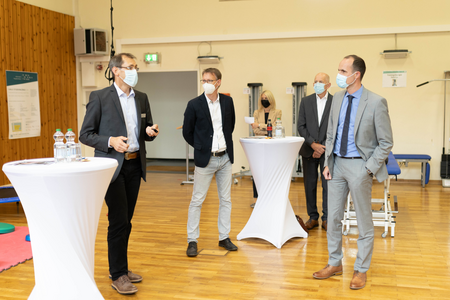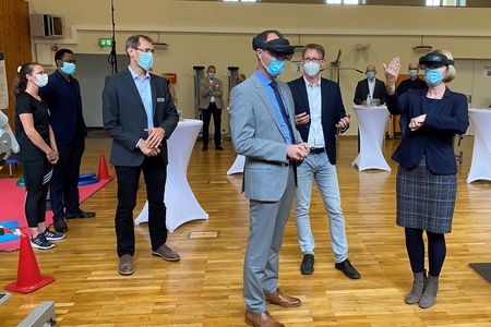 Das Team um den Fachrichtungsleiter Prof. Dr. Steffen Müller demonstrierte beispielhaft den aktuellen technologischen Stand bei der Digitalisierung evidenzbasierter Bewegungstherapien am Beispiel des Rückenschmerzes und gab einen Ausblick auf die daraus abgeleiteten neuen Forschungsansätze für zukünftige Promotionsprojekte. Darüber hinaus konnten sowohl der Minister als auch die Präsidentin der Hochschule eigene Erfahrung mit den zu entwickelnden Technologien zur 3D Bewegungserfassung, dem Biofeedback und der Visualisierung mittels Augmented Reality für ein Eintauchen in eine künstliche Welt mit möglichst allen Sinnen machen. Auch die Promovenden (Sarah Tenberg, Mishael Adje) zeigten Aspekte ihrer Forschungsarbeiten.