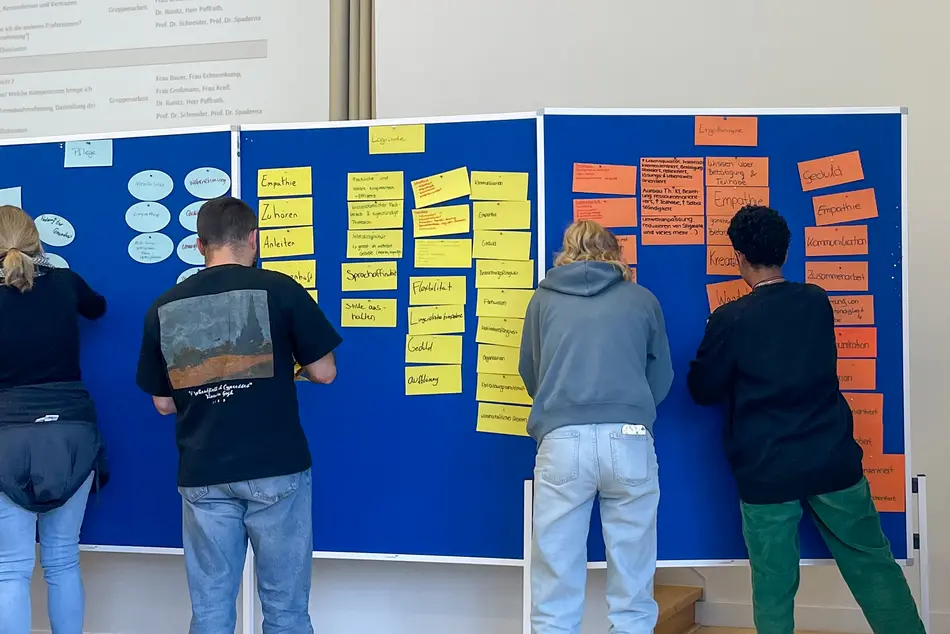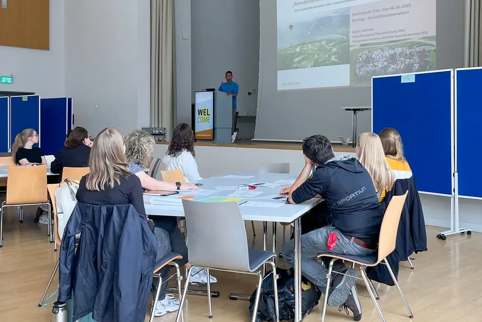 Nach einem einführenden Vortrag von Prof. Dr. Schneider zum Thema interprofessionelle Zusammenarbeit beleuchtete Glenn Paffrath das Thema aus Sicht der Rehabilitationsmedizin. Im Anschluss arbeiteten die Studierenden gemeinsam an den Merkmalen und Kernkompetenzen der beteiligten Berufsgruppen. Im Fokus standen sowohl professionsspezifische Unterschiede als auch potenzielle Schnittstellen und Synergien.