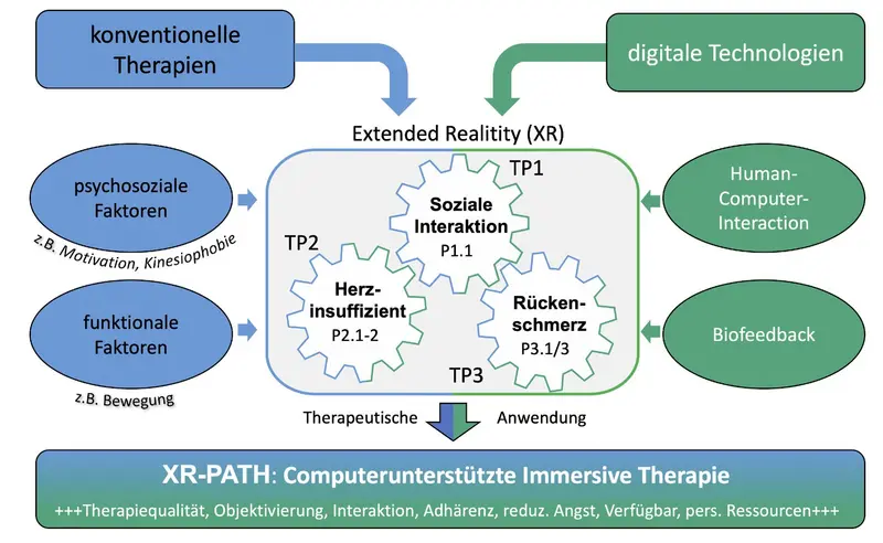 Das geförderte Forschungskolleg XR-PATH zielt in insgesamt 6 kooperativen Promotionsprojekten, die gemeinsam von der Hochschule Trier und Universität Trier getragen werden, auf eine wissenschaftlich valide Entwicklung immersiver Extended Reality (XR) basierter Lösungen für das Gesundheitswesen ab.