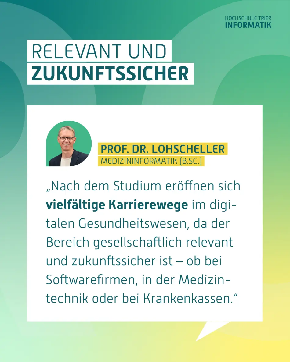 Nach dem Studium stehen den Absolventinnen und Absolventen viele Wege offen – denn die digitale Transformation im Gesundheitswesen schafft einen wachsenden Bedarf an IT-Expertinnen und -Experten. Ob in Softwareunternehmen, bei IT-Dienstleistern im Gesundheitssektor, in der Medizintechnik, bei Krankenkassen oder in Forschungseinrichtungen und Behörden – die Einsatzbereiche sind vielfältig. Gleichzeitig ist der medizinische Bereich langfristig gesellschaftlich hochrelevant. Wer etwas Sinnvolles tun und gleichzeitig an innovativen Lösungen mitarbeiten möchte, ist hier genau richtig.