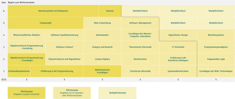 Alle Absolventen des Fachbereichs werden unabhängig von ihrer individuellen Spezialisierung in gleichem Maße auf softwareorientierte Berufsbilder mit wechselnden Anforderungen im IT-Arbeitsmarkt vorbereitet. Dies erreichen wir durch einen für alle Bachelor-Studiengänge identischen Kern des Studienablaufplans.