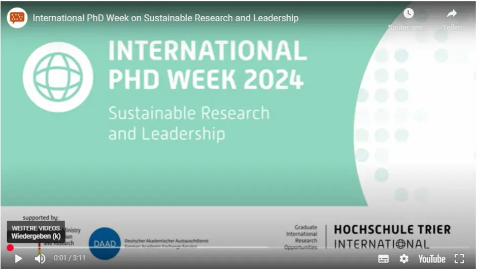 Die Hochschule Trier bedankt sich bei allen Teilnehmenden, Referent*innen und Unterstützern, die zum Erfolg der International PhD Week 2024 beigetragen haben. Die Summer School fand im Rahmen des Projekts “Graduate International Research Opportunities“ statt, das in der Förderlinie HAW.International vom Deutschen Akademischen Austauschdienst (DAAD) gefördert wird.