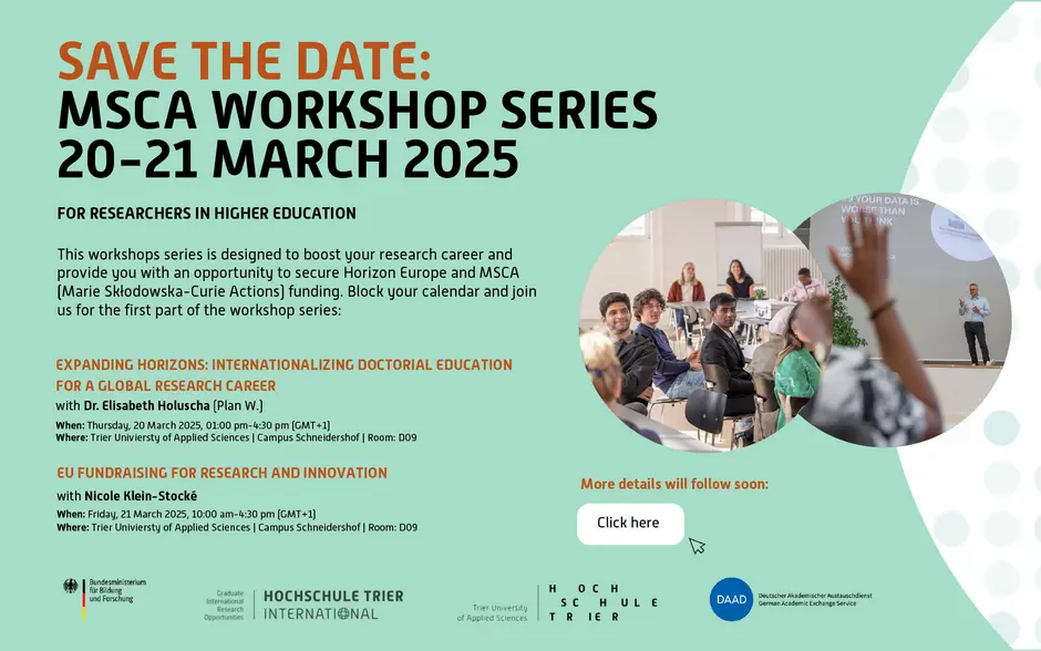 Genau dieser Herausforderung widmete sich unsere Workshopserie im Rahmen von MSCA und Horizon Europe am 20. und 21. März 2025 am Campus Schneidershof der Hochschule Trier. Zum Auftakt luden wir Forschende der Hochschule Trier und ihrer Partneruniversitäten in Luxemburg, Belgien, Frankreich und der Schweiz ein. Die Veranstaltungsreihe zeigte eindrucksvoll, wie gezielte Vernetzungsmethoden den Erfolg von Forschungskooperationen fördern und welche Richtlinien für die erfolgreiche Einreichung eines Förderantrags beachtet werden müssen.