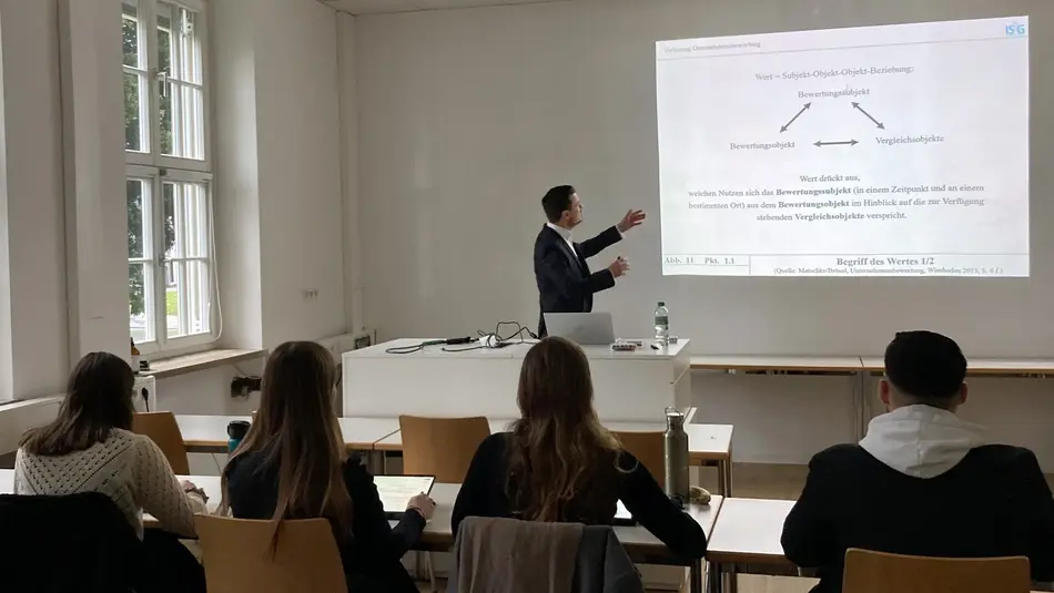 Prof. Dr. David Rapp vom Institut Supérieur de Gestion / ISG International Business School Paris hat im Wintersemester 23/24 im Masterprogramm Business Management, mit der Vertiefungsrichtung „Accounting and Audit“, im Modul Business Valuation Case Studies die Veranstaltung „Funktionale Wertlehre im Zuge der Unternehmensbewertung“ angeboten. Alle Studierenden dieser Vertiefungsrichtung nahmen an den Vorlesungen von Prof. Dr. Rapp teil.