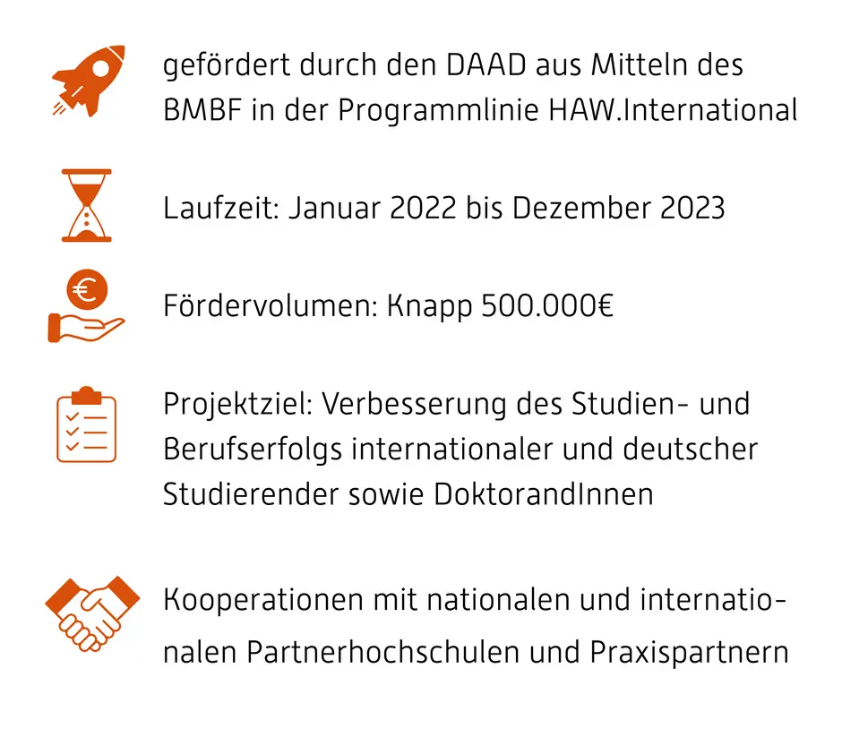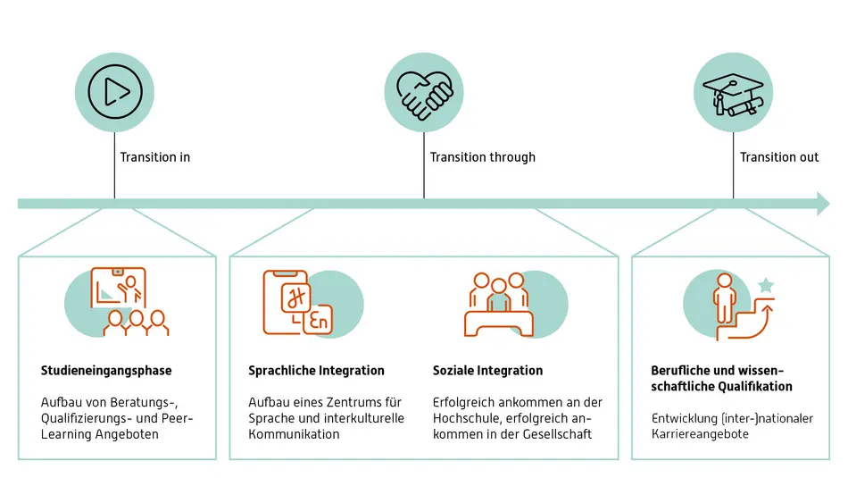 Das Projekt „Hochschule Trier International: Übergänge erfolgreich gestalten“, das zwischen 2022 bis 2023 mit einem Fördervolumen von knapp 500.000 Euro gefördert wird, verfolgt das Ziel den Studien- und Berufserfolg internationaler und deutscher Studierender sowie DoktorandInnen zu verbessern. Sie sollen bestmöglich auf den (inter)nationalen Arbeits- und Forschungsmarkt in der Großregion und darüber hinaus vorbereitet werden. Hierzu werden bereits bestehende Angebote in Kooperation mit den Fachbereichen und Service-Einrichtungen der Hochschule Trier zur zielgruppenspezifischen Information, Beratung und Betreuung entlang der verschiedenen Phasen der Student/Dissertation Journey gebündelt, optimiert und ergänzt.